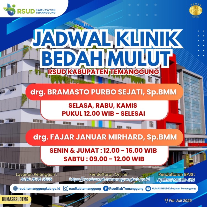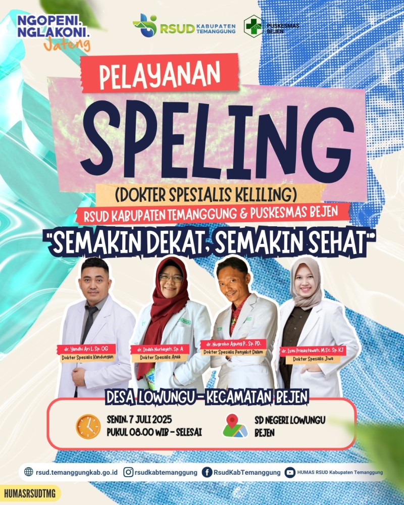 Berita Kategori: Smart Government (Pemerintah Cerdas) SPI Rabu, 16/07/2025 09:26 65 Pelayanan SPELING (Dokter Spesialis Keliling) Hadir Lebih Dekat dengan Anda! Selengkapnya Kategori: Smart Government (Pemerintah Cerdas) SPI Jumat, 11/07/2025 09:33 303 Mau daftar berobat tanpa antre? Selengkapnya Kategori: Smart Government (Pemerintah Cerdas) SPI Kamis, 10/07/2025 09:30 50 RSUD Kabupaten Temanggung Layani Pemeriksaan Kesehatan Peserta PPPK 2024 Selengkapnya Kategori: Smart Government (Pemerintah Cerdas) SPI Selasa, 08/07/2025 10:11 43 Layanan Dokter Spesialis Keliling (SPELING) Hadir di Desa Lowungu! Selengkapnya Kategori: Smart Living (Hidup Cerdas) SPI Selasa, 08/07/2025 10:09 159 RSUD Kabupaten Temanggung bekerja sama dengan PMI Temanggung mengadakan kegiatan donor darah rutin untuk masyarakat umum dan karyawan di Lobby Gedung B, Sabtu 5 Juli 2025. Selengkapnya Kategori: Smart Government (Pemerintah Cerdas) SPI Senin, 07/07/2025 10:08 46 Pelayanan SPELING (Dokter Spesialis Keliling) Hadir Lebih Dekat dengan Anda! Selengkapnya Kategori: Smart Government (Pemerintah Cerdas) SPI Selasa, 01/07/2025 08:03 47 "SELAMAT HARI BHAYANGKARA KE-79" Selengkapnya Kategori: Smart Government (Pemerintah Cerdas) SPI Selasa, 01/07/2025 08:01 50 SELAMAT MEMASUKI PURNA TUGAS Per 1 Juli 2025 Selengkapnya Kategori: Smart Government (Pemerintah Cerdas) SPI Senin, 30/06/2025 09:07 76 Informasi Jadwal Poliklinik KLINIK BEDAH MULUT Selengkapnya Kategori: Smart Government (Pemerintah Cerdas) SPI Senin, 30/06/2025 08:29 46 SELAMAT & SUKSES Selengkapnya Kategori: Smart Government (Pemerintah Cerdas) SPI Senin, 30/06/2025 08:20 61 Halo Warga Temanggung yang sedang dan akan ada keperluan di Kota Yogyakarta dan Kota Semarang Selengkapnya Kategori: Smart Government (Pemerintah Cerdas) SPI Sabtu, 28/06/2025 11:09 49 Selamat Tahun Baru Islam 1 Muharram 1447 H Selengkapnya FirstPrev1314151617NextLast