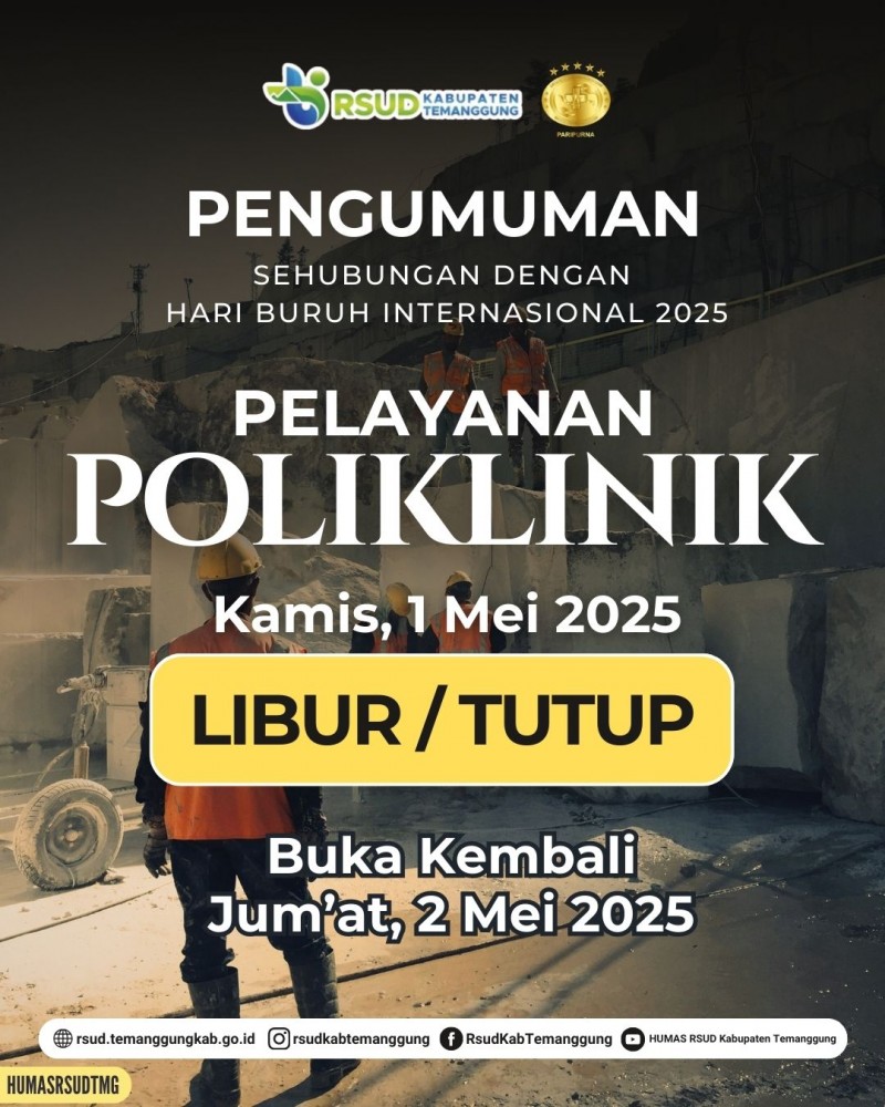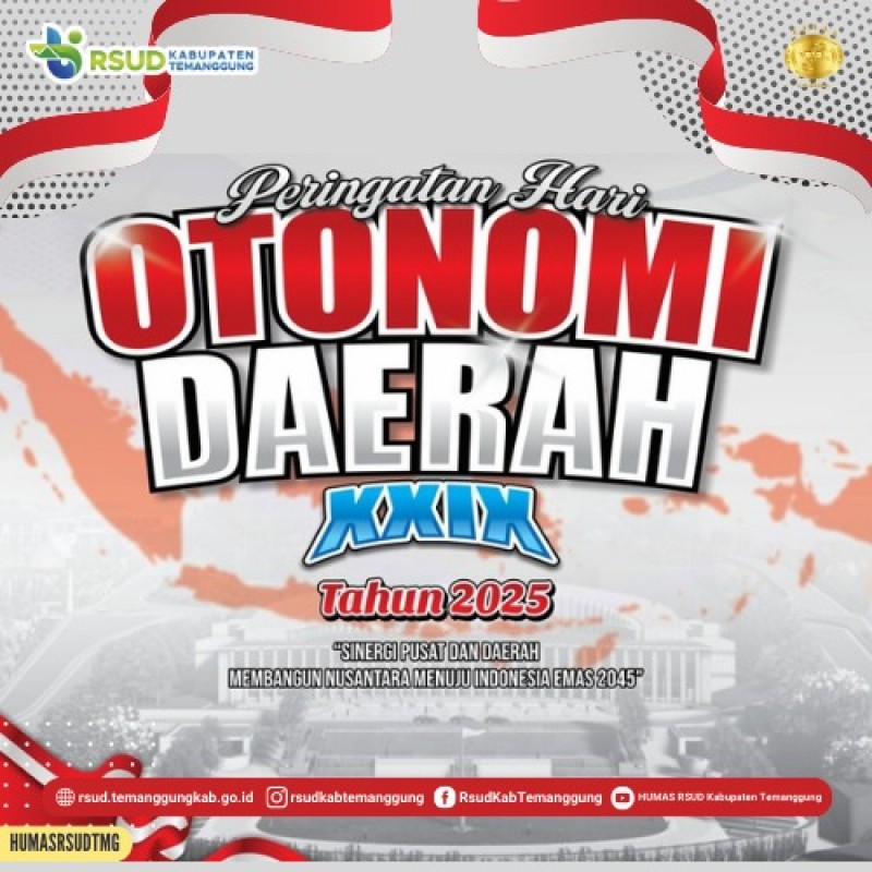 Berita Kategori: Smart Living (Hidup Cerdas) SPI Sabtu, 03/05/2025 11:33 220 Peringatan Hari Pendidikan Nasional Tahun 2025 Selengkapnya Kategori: Smart Government (Pemerintah Cerdas) SPI Sabtu, 03/05/2025 11:29 69 Sehat Bersama KORPRI: RSUD Kabupaten Temanggung Hadirkan Layanan Cek Kesehatan Gratis Selengkapnya Kategori: Smart Living (Hidup Cerdas) SPI Jumat, 02/05/2025 11:25 218 "Selamat Hari Pendidikan Nasional 2025" Selengkapnya Kategori: Smart Economy (Ekonomi Cerdas) SPI Kamis, 01/05/2025 11:23 325 "Selamat Hari Buruh 1 Mei 2025" Selengkapnya Kategori: Smart Government (Pemerintah Cerdas) SPI Rabu, 30/04/2025 11:21 79 Merajut Silaturahmi, Menguatkan Ukhuwah bersama Paguyuban Pensiunan RSUD Kabupaten Temanggung Selengkapnya Kategori: Smart Living (Hidup Cerdas) SPI Rabu, 30/04/2025 11:16 132 Penyuluhan Serentak Pekan Imunisasi Dunia (PID) Tahun 2025 "Ayo Lengkapi Imunisasi, Generaasi Sehat Menuju Indonesia Emas" Selengkapnya Kategori: Smart Government (Pemerintah Cerdas) SPI Selasa, 29/04/2025 09:42 104 INFORMASI LAYANAN POLIKLINIK Selengkapnya Kategori: Smart Government (Pemerintah Cerdas) SPI Jumat, 25/04/2025 08:49 99 SELAMAT HARI OTONOMI DAERAH KE-29 Selengkapnya Kategori: Smart Government (Pemerintah Cerdas) SPI Rabu, 23/04/2025 12:35 86 Orientasi Mahasiswa Praktik di RSUD Kabupaten Temanggung Selengkapnya Kategori: Smart Government (Pemerintah Cerdas) SPI Rabu, 23/04/2025 12:30 81 Direktur RSUD Kabupaten Temanggung Hadiri Peringatan Hari Perempuan Internasional dan Hari Kartini 2025 Selengkapnya Kategori: Smart Government (Pemerintah Cerdas) SPI Selasa, 22/04/2025 07:47 531 Apel Luar Biasa Peringatan Hari Kartini Tahun 2025 Selengkapnya Kategori: Smart Government (Pemerintah Cerdas) SPI Senin, 21/04/2025 09:18 525 Selamat Hari Kartini 21 April 2025 Selengkapnya FirstPrev1718192021NextLast