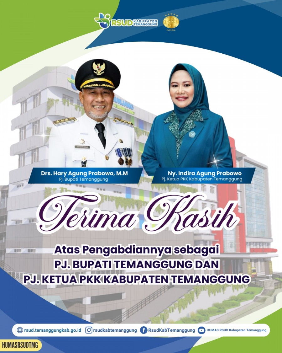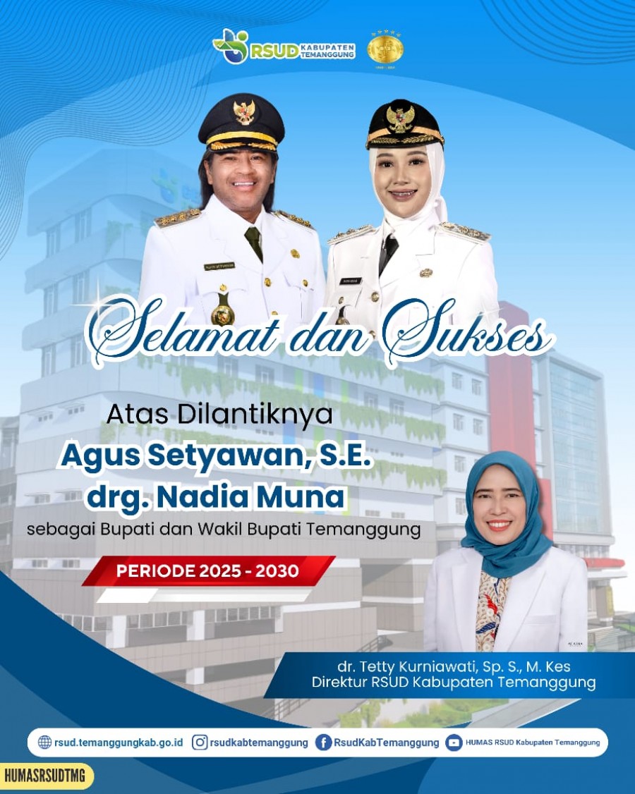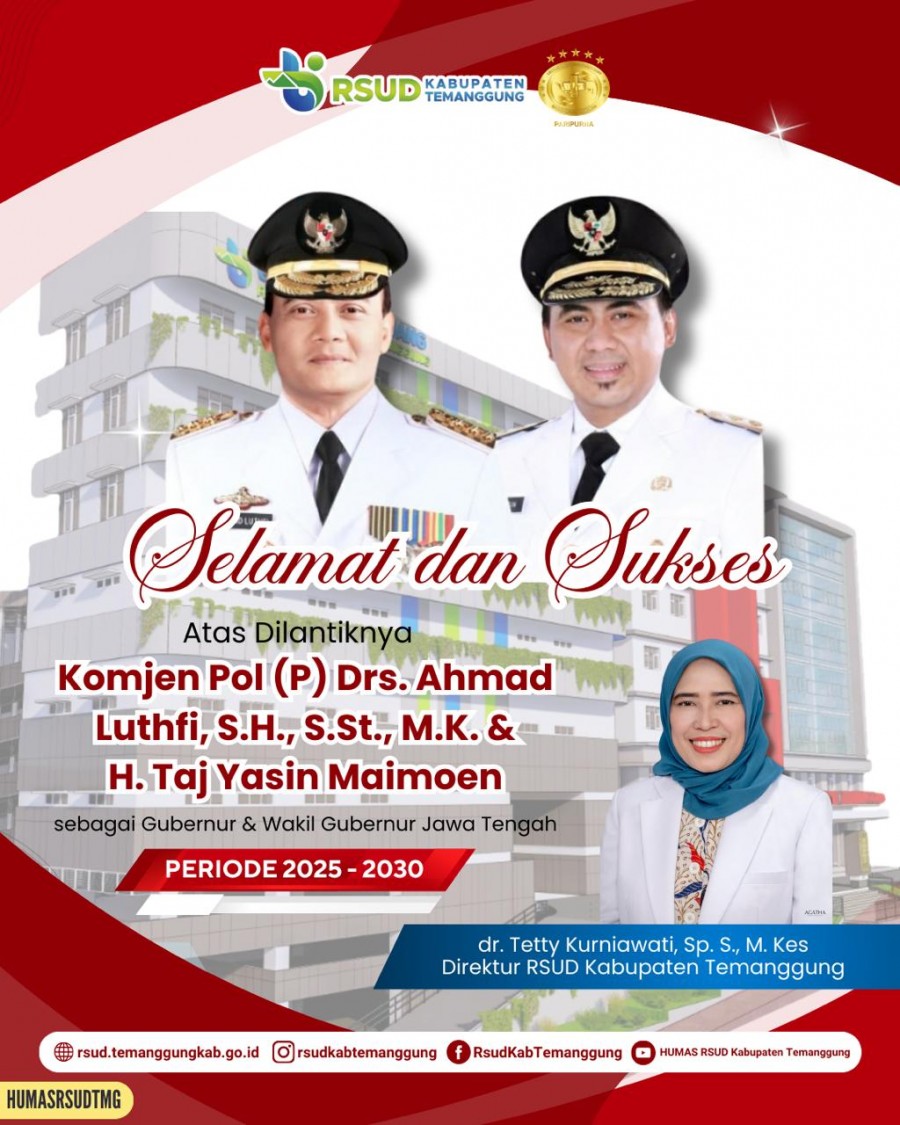 Berita Kategori: Smart Government (Pemerintah Cerdas) SPI Sabtu, 01/03/2025 08:16 101 MARHABAN YA RAMADHAN Selengkapnya Kategori: Smart Government (Pemerintah Cerdas) SPI Selasa, 25/02/2025 08:30 134 Kaji Banding RSUD KRT. Setjonegoro Kabupaten Wonosobo ke RSUD Kabupaten Temanggung Selengkapnya Kategori: Smart Government (Pemerintah Cerdas) SPI Senin, 24/02/2025 08:27 159 Asesmen Kompetensi Perawat & Bidan Rsud Kabupaten Temanggung Selengkapnya Kategori: Smart Government (Pemerintah Cerdas) SPI Senin, 24/02/2025 07:56 104 RSUD Kabupaten Temanggung Menerima Kunjungan Studi Banding Pelayanan NAPZA dari RSUD dr. H. Soewondo Kabupaten Kendal Selengkapnya Kategori: Smart Government (Pemerintah Cerdas) SPI Jumat, 21/02/2025 07:50 140 KAJIAN ONLINE UNTUK UMUM Selengkapnya Kategori: Smart Government (Pemerintah Cerdas) SPI Kamis, 20/02/2025 07:55 106 SELAMAT DAN SUKSES Atas Pelantikan Gubernur dan Wakil Gubernur Jawa Tengah periode 2025-2030 Selengkapnya Kategori: Smart Government (Pemerintah Cerdas) SPI Kamis, 20/02/2025 07:49 119 Terima kasih kepada Bapak Drs. Hary Agung Prabowo, M.M. dan Ibu Indira Agung Prabowo Selengkapnya Kategori: Smart Government (Pemerintah Cerdas) SPI Kamis, 20/02/2025 07:47 109 SELAMAT DAN SUKSES Atas Pelantikan Bupati dan Wakil Bupati Temanggung masa bakti 2025 - 2030 Selengkapnya Kategori: Smart Government (Pemerintah Cerdas) SPI Rabu, 19/02/2025 10:25 161 Pemeriksaan Kesehatan Bupati Terpilih Kabupaten Temanggung Masa Jabatan 2025-2030 Selengkapnya Kategori: Smart Government (Pemerintah Cerdas) SPI Rabu, 19/02/2025 10:24 181 RSUD Kabupaten Temanggung Siap Menuju Akreditasi 2025 Selengkapnya Kategori: Smart Government (Pemerintah Cerdas) SPI Rabu, 19/02/2025 09:44 140 RSUD Kabupaten Temanggung bekerja sama dengan PMI Temanggung mengadakan kegiatan donor darah rutin untuk masyarakat umum dan karyawan di Lobby Gedung B, Sabtu 15 Februari 2025. Selengkapnya Kategori: Smart Government (Pemerintah Cerdas) SPI Selasa, 18/02/2025 10:52 94 Orientasi Mahasiswa Praktik di RSUD Kabupaten Temanggung Selengkapnya FirstPrev2122232425NextLast