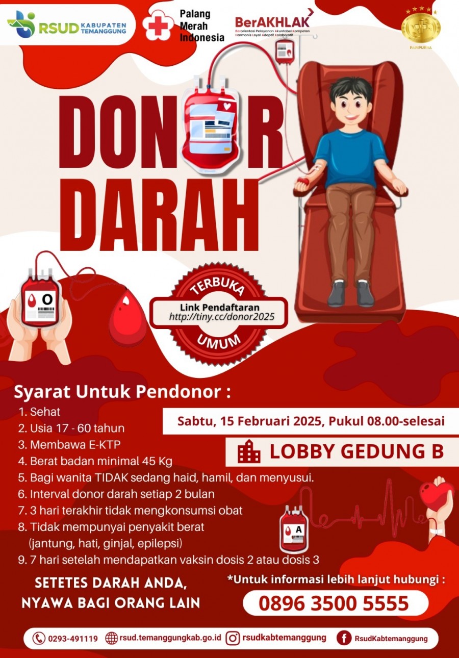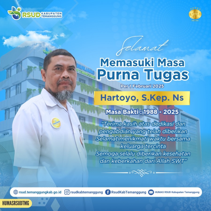 Berita Kategori: Smart Government (Pemerintah Cerdas) SPI Sabtu, 15/02/2025 08:03 106 Koordinasi Pengadaan Barang/Jasa & Sosialisasi Coretax Selengkapnya Kategori: Smart Government (Pemerintah Cerdas) SPI Kamis, 13/02/2025 08:03 110 RSUD Kabupaten Temanggung Hadir di Gelaran Lapak PKK Selengkapnya Kategori: Smart Government (Pemerintah Cerdas) SPI Rabu, 12/02/2025 11:32 127 DONOR DARAH UNTUK MASYARAKAT UMUM Selengkapnya Kategori: Smart Government (Pemerintah Cerdas) SPI Rabu, 12/02/2025 09:17 101 Dalam rangka Program Kerja KORPRI Kabupaten Temanggung 2022–2027, berbagai kegiatan kesehatan seperti senam sehat, donor darah, dan cek kesehatan gratis digelar untuk anggota KORPRI Selengkapnya Kategori: Smart Government (Pemerintah Cerdas) SPI Selasa, 11/02/2025 11:35 66 RSUD Kabupaten Temanggung Hadir di Gelaran Lapak PKK Selengkapnya Kategori: Smart Government (Pemerintah Cerdas) SPI Senin, 10/02/2025 08:17 60 "Selamat Hari Pers Nasional 2025 " Selengkapnya Kategori: Smart Government (Pemerintah Cerdas) SPI Jumat, 07/02/2025 08:00 134 KAJIAN ONLINE UNTUK UMUM Selengkapnya Kategori: Smart Government (Pemerintah Cerdas) SPI Rabu, 05/02/2025 11:42 156 SELAMAT HARI KANKER SEDUNIA 2025 Selengkapnya Kategori: Smart Government (Pemerintah Cerdas) SPI Sabtu, 01/02/2025 10:26 101 SELAMAT MEMASUKI PURNA TUGAS Selengkapnya Kategori: Smart Government (Pemerintah Cerdas) SPI Sabtu, 01/02/2025 10:26 200 SELAMAT MEMASUKI PURNA TUGAS Selengkapnya Kategori: Smart Government (Pemerintah Cerdas) SPI Sabtu, 01/02/2025 09:06 190 Pelepasan Purna Tugas Per 1 Februari 2025 Selengkapnya Kategori: Smart Government (Pemerintah Cerdas) SPI Sabtu, 01/02/2025 09:03 115 Dalam rangka memperingati Hari Gizi Nasional Ke-65 dengan tema "Pilih Makanan Bergizi untuk Keluarga Sehat" Selengkapnya FirstPrev2223242526NextLast