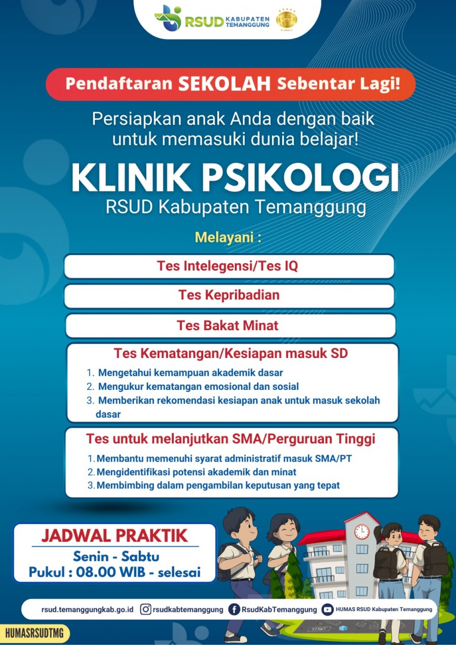 Berita Kategori: Smart Government (Pemerintah Cerdas) SPI Sabtu, 01/02/2025 09:02 98 Dalam rangka memperingati Hari Gizi Nasional Ke-65 dengan tema "Pilih Makanan Bergizi untuk Keluarga Sehat" Selengkapnya Kategori: Smart Government (Pemerintah Cerdas) SPI Jumat, 31/01/2025 10:24 132 KAJIAN ONLINE UNTUK UMUM Selengkapnya Kategori: Smart Government (Pemerintah Cerdas) SPI Kamis, 30/01/2025 09:13 123 Klinik Psikologi RSUD Kabupaten Temanggung! Selengkapnya Kategori: Smart Government (Pemerintah Cerdas) SPI Senin, 27/01/2025 08:48 89 Selamat Memperingati Isra' Mi'raj Nabi Muhammad SAW, 27 Rajab 1446 H Selengkapnya Kategori: Smart Government (Pemerintah Cerdas) SPI Sabtu, 25/01/2025 11:17 139 SELAMAT HARI GIZI NASIONAL KE-65! Selengkapnya Kategori: Smart Government (Pemerintah Cerdas) SPI Sabtu, 25/01/2025 11:15 159 Orientasi Mahasiswa Praktik di RSUD Kabupaten Temanggung Selengkapnya Kategori: Smart Government (Pemerintah Cerdas) SPI Sabtu, 25/01/2025 07:47 122 KAJIAN ONLINE UNTUK UMUM Selengkapnya Kategori: Smart Government (Pemerintah Cerdas) SPI Sabtu, 25/01/2025 07:44 184 Pelepasan 22 Dokter Muda Angkatan 67 Selengkapnya Kategori: Smart Government (Pemerintah Cerdas) SPI Sabtu, 25/01/2025 07:36 257 INFORMASI LAYANAN POLIKLINIK Selengkapnya Kategori: Smart Government (Pemerintah Cerdas) SPI Rabu, 22/01/2025 13:46 122 E-Kalender RSUD Kabupaten Temanggung 2025 Selengkapnya Kategori: Smart Government (Pemerintah Cerdas) SPI Selasa, 21/01/2025 08:50 83 Penandatanganan dokumen Perjanjian Kinerja Tahun 2025 oleh Pejabat Struktural di lingkungan RSUD Kabupaten Temanggung pada apel pagi di Lobby Gedung B, Senin (20/1/2025). Selengkapnya Kategori: Smart Government (Pemerintah Cerdas) SPI Selasa, 21/01/2025 08:48 150 Khitan Massal Dalam Rangka Memperingati HUT BAZNAS ke-24! Selengkapnya FirstPrev2324252627NextLast